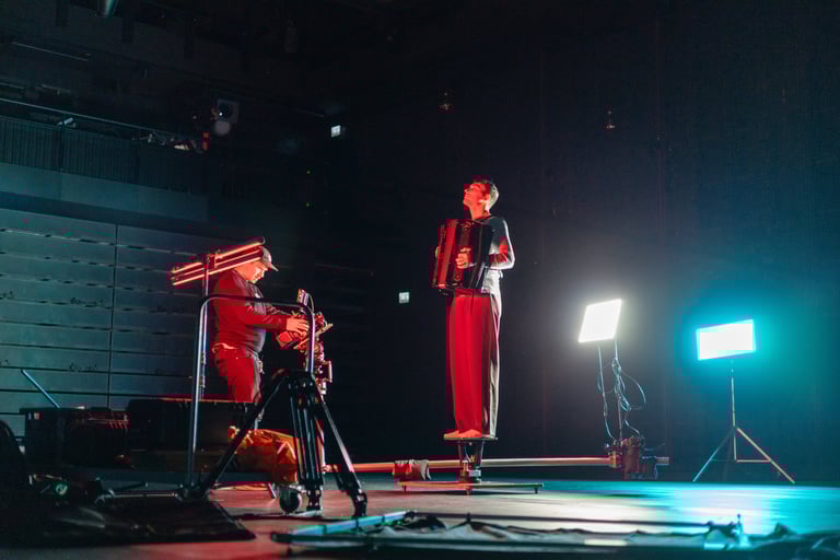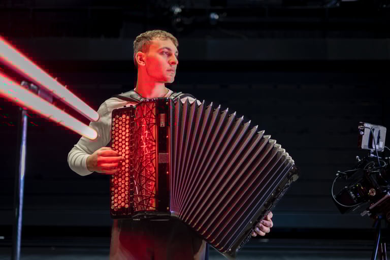 The audience is invited to experience the music from within the space - moving freely, sitting or lying down, and listening from different perspectives. The accordion is not presented as a virtuosic solo instrument, but as part of a wider sonic and physical landscape shaped by electronics, light, and proximity.